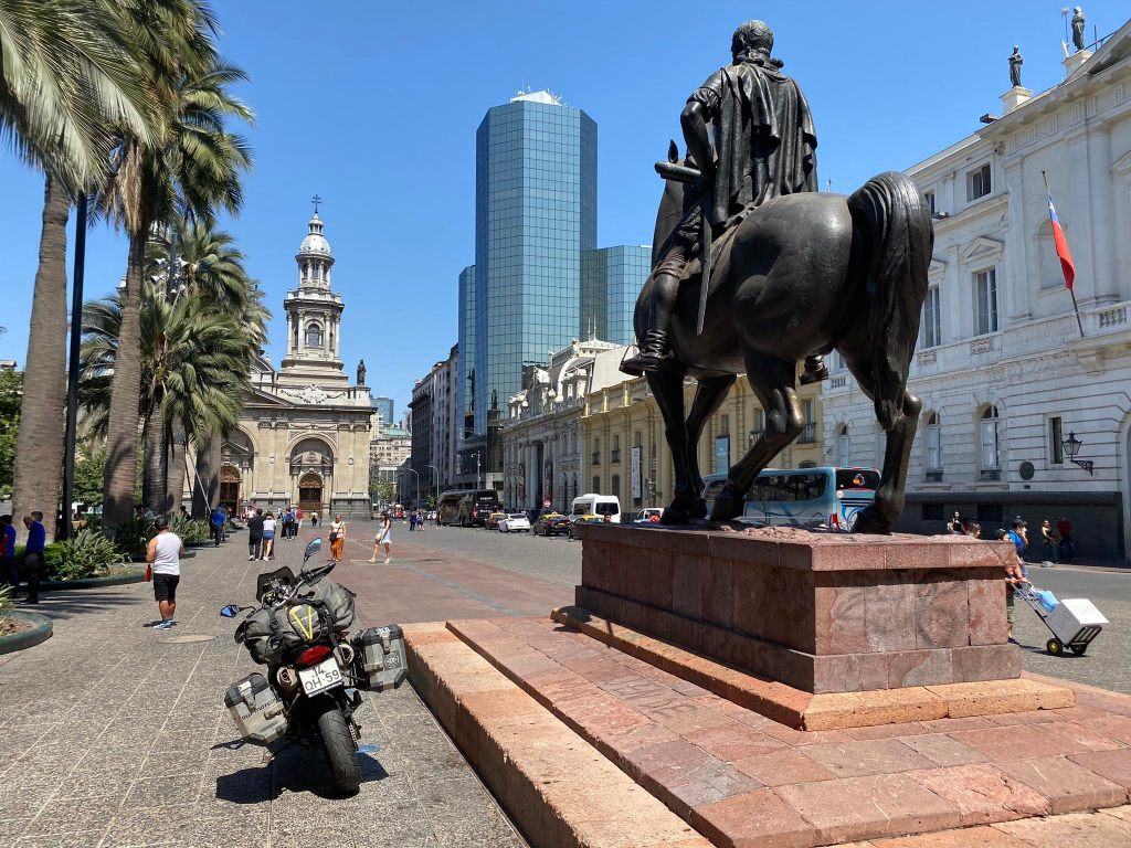 Partida da Plaza de Armas de Santiago do Chile, vendo-se ao fundo a Catedral Metropolitana.