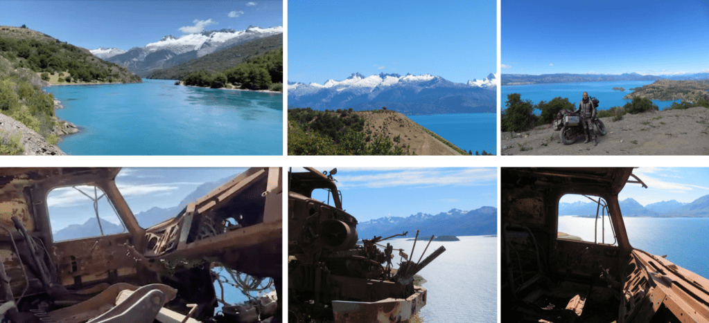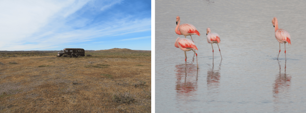 Furgão abandonado na Patagónia Argentina (Rio Galegos) e flamingos numa lagoa da estepe.