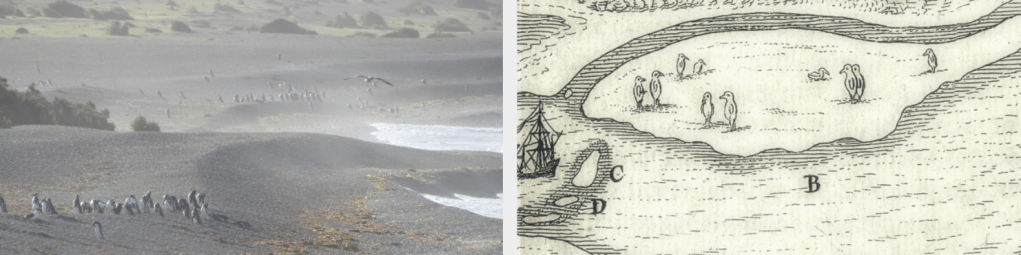 A pinguinera de Punta Tumbo e excerto do mapa do Estreito de Magalhães elaborado por Schouten y Le Maire en 1616, que representa pinguins numa ilha da baía de San Julian.