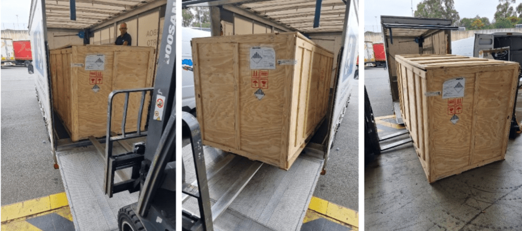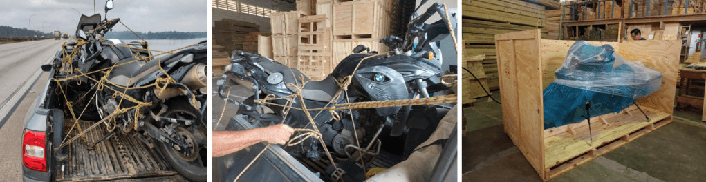 A Kuda a caminho da empresa que iria fazer a caixa de madeira certificada para poder seguir viagem via aérea de São Paulo para Lisboa na Tap Cargo, chegada à empresa e processo de embalagem.