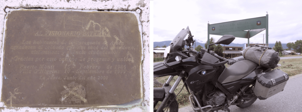 Monumento e placa de agradecimento a Augusto Pinochet pela construção do último troço da “Carretera Austral” entre La Junta e Vila O’Higgins, terminada a 10 de setembro de 1999.