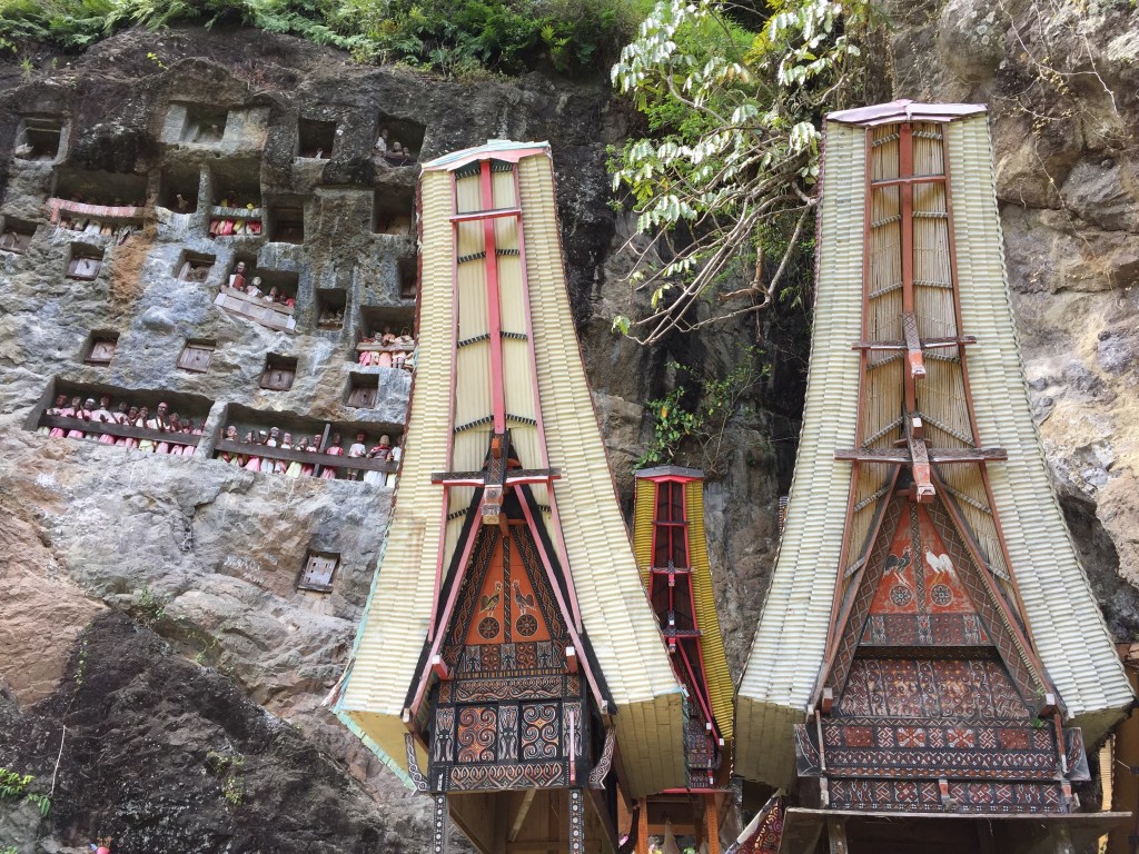 No centro da ilha, a região de Tana Toraja. Nesta, a morte e os ritos funerários têm particular interesse turístico-museológico. Na aldeia de Lemo, aos mortos é dada uma sepultura em grutas escavadas nas arribas das formações rochosas que limitam os arrozais onde os vivos labutam sob a presença atenta dos que os antecederam. Representações quase perfeitas, esculpidas em madeira, perfilam-se em varandas, frente às aberturas onde se guardam os sarcófagos, como quem vigia de cima o quotidiano dos vivos. Turistas indonésios e chineses fazem pose junto a estátuas em madeira que representam pessoas falecidas. Na escarpa, plataformas seguram urnas sobre o vazio.