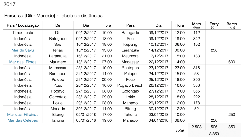 A viagem de regresso Díli-Lisboa completou a sua primeira etapa, cumprindo um total de 2968 kms de rota, realizados em 28 dias, atravessando as ilhas de Timor, Flores, Sulawesy, Arquipélago Sangihe e os Mares de Savu, Flores, Celebes e Filipinas. Dominantes, as chuvas de monção, castigaram severamente a jornada, obrigando a cuidados e penosos esforços de condução e estoicismo físico, ao longo do percurso sinuoso de montanhas, longas cordilheiras e arribas de costa que marcam a geografia fantasiosa da ilha de Sulawesy.