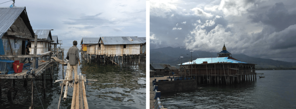 Nos passadiços da aldeia palafita Bugi em Maumere e imagem da mesquita.